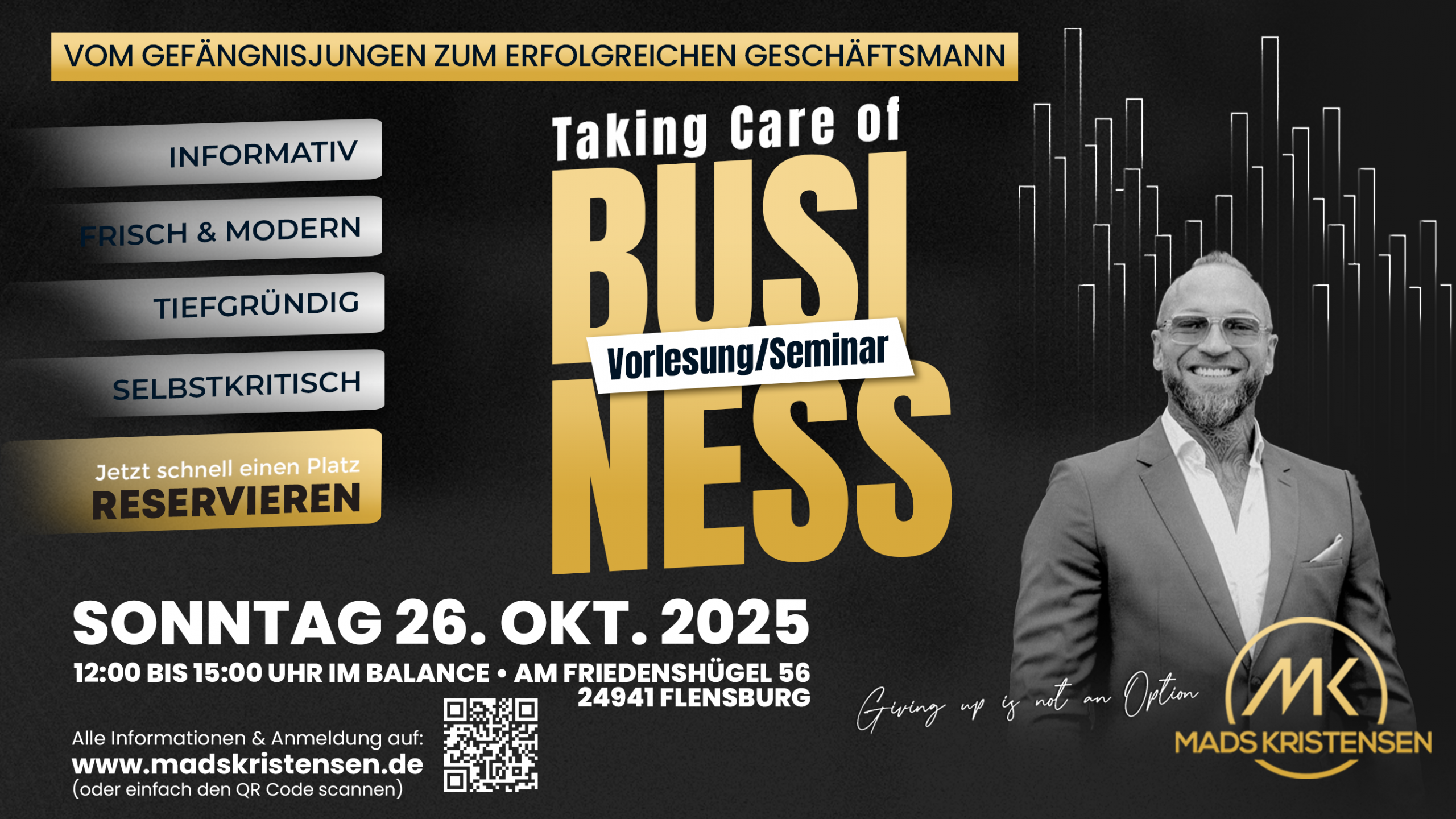 Mads Kristensen wird Ihnen in dieser Vorlesung seinen Weg vom Gefängnisjungen zum erfolgreichen Geschäftsmann näherbringen. Erfahren Sie, wie Sie, mit eisernem Willen, viel Energie und jeglicher harten Vergangenheit es schaffen können, auch Ihr Business erfolgreich zu machen. Mehr möchten wir aber noch nicht verraten.